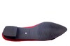 Ballerina op spitse leest en chique combinatie van roestoranje suede, bruin leer en zwart lakneusje. Over het voorblad een zwart-bruin ornament om de combinatie helemaal af te maken. Dit ontwerp is er ook in pumpvorm op hak van 5 cm in blauw-zwart combinatie.