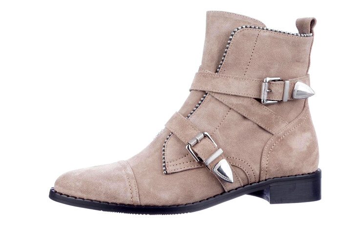 Deze platte enkellaars op wat spitsere leest is fraai afgewerkt met sierrits en dubbele gesp. Comfortabel plat en toch elegant en trendy. Uit de Italiaanse| fabriek van Evaluna, gemaakt in het het gebied van de Marken in Italië dat beroemd is om de hoge kwaliteit, alleen de beste materialen worden gebruikt. Dit model is er in zwart leer me een mooie nerf en in beige suède.