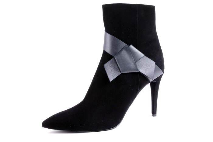 Design enkellaars op spitse leest en naaldhakje van 9 cm; de basis is zwart| suède en diagonaal is een gestyleerde antraciet leren strik rond de enkel| gevouwen; zeer stijlvol en feestelijk; op deze leest bieden we ook een leren| pump aan.|