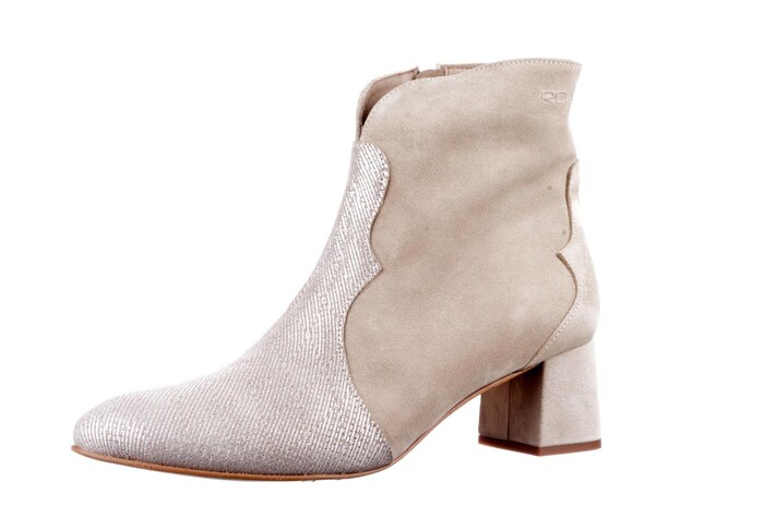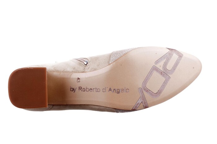 Roberto d'Angelo Shoes brengt het beste van twee werelden samen. Het Nederlandse echtpaar Marjorie en Alfred  combineren al meer dan 30 jaar verfijnd Italiaanse design met een Noord-Europese pasvorm. Dit  resulteert in schoenen die niet alleen stijlvol zijn, maar ook uitzonderlijk comfortabel en geschikt voor diverse voeten. Roberto omarmt duurzaamheid als een leidraad bij de productie en gelooft dat mode hand in hand kan gaan met duurzaamheid. Elk paar is vervaardigd met luxe leer, wat niet alleen een symbool is van vakmanschap, maar ook een statement van tijdloze elegantie en duurzaamheid. Hun motto: Gun je voeten het genot van Italiaans design. Deze zomerlaars op klassieke leest een hakje van 4 cm is uitgevoerd in beige suède en mooie soft metallic print. Past overal bij.