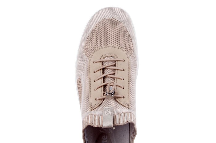 Lichtgewijcht gebreide instapper in jeans en oud roze. De veter kan met een stopper worden aangesnoerd.