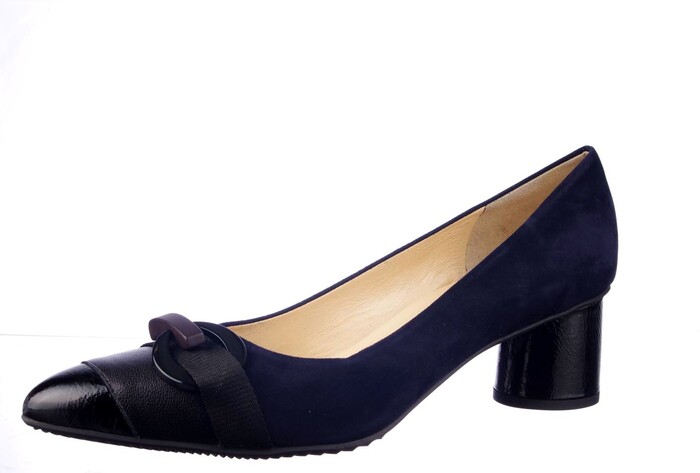 Pump op spitse leest in chique combinatie van donkerblauw suede en zwart leer. Over het voorblad een zwart-bruin ornament om de combinatie helemaal af te maken. Dit ontwerp is er ook als ballerina roestoranje suede, bruin leer en met zwart lakneusje
