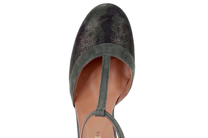 Het Spaanse Jhay maakt mooie dansschoentjes en we zien de flamengo voor ons.| Deze t-band pump heeft een flinke hak van 7 cm maar het bandje over de wreef| geeft goede sluiting. In groen suède met metallic finish.|