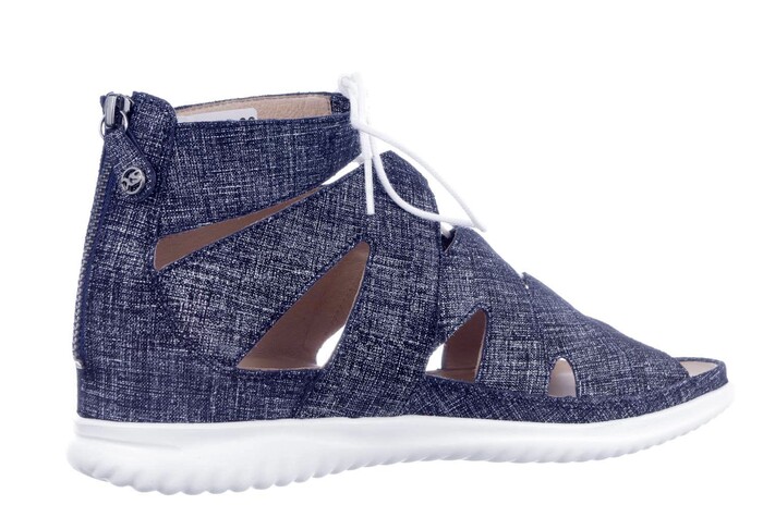 Romeinse vetersandaal met verwisselbaar voetbed. Ideale pasvorm met rits over de| hiel. Vederlicht voetbed met prima demping en leren binnenzool. In frisse| jeansprint.|