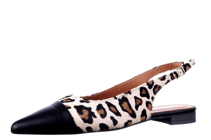 Yvonne en William Wiggers hebben een prachtig Nederlands merk in de markt gezet dat inmiddels heel Europa verovert. Het mooie is dat ze op verzoek van Caland t/m maat 46 produceren. Yvonne volgt alle stijlen en weet in overleg met fabrikanten prachtige modellen te ontwerpen met een hele vrouwelijke touch. Sneakers zijn prima maar er zijn ook andere mogelijkheden. Yvonne zegt: Je gevoel kan duizend dingen zijn. Je stijl kan veranderen als het weer. Bekijk het van dag tot dag en laat je stemming je inspireren. Laat onze ongedwongen luxe de basis zijn voor jouw plezier en vrijheid. Deze platte slingback op spitse leest is een knipoog naar Chanel met het zwarte neusje. De panterrprint geeft deze flat een pittige look en combineert makkelijk met diverse outfits.