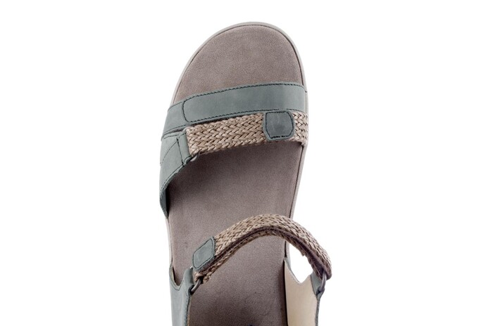 Hoewel het merk Wolky doet denken aan het Engelse ‘walk’ (to walk = lopen) was dat niet de reden om voor die naam te kiezen. De oprichters zochten in 1982 de associatie met de Nederlandse wolken; zodra je een paar aantrekt loop je op en in de wolken. Om dat gevoel te bereiken zijn de voetbedden volgens anatomisch ontwerp samengesteld uit memory foam, natuurlijke kurk en een leren toplaag. De leesten zijn kenmerkend rond, gezwaaid gevormd en laten voldoende teenruimte. De meeste onderwerken lopen door en bieden veel demping maar er zijn ook modellen op stevige hakken tot 4,5 cm. De ontwerpen zijn eigenzinnig met een knipoog naar fashion. Inmiddels is het een wereldwijd verkocht merk dat nog steeds in handen is van de familie. Deze sandaal met driedubbele klitteband in de natuurtinten groen en cognac heeft wat dunnere bandjes. De zon kan gaan schijnen.