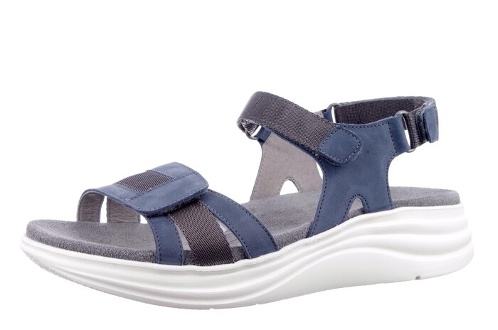 Hoewel het merk Wolky doet denken aan het Engelse ‘walk’ (to walk = lopen) was dat niet de reden om voor die naam te kiezen. De oprichters zochten in 1982 de associatie met de Nederlandse wolken; zodra je een paar aantrekt loop je op en in de wolken. Om dat gevoel te bereiken zijn de voetbedden volgens anatomisch ontwerp samengesteld uit memory foam, natuurlijke kurk en een leren toplaag. De leesten zijn kenmerkend rond, gezwaaid gevormd en laten voldoende teenruimte. De meeste onderwerken lopen door en bieden veel demping maar er zijn ook modellen op stevige hakken tot 4,5 cm. De ontwerpen zijn eigenzinnig met een knipoog naar fashion. Inmiddels is het een wereldwijd verkocht merk dat nog steeds in handen is van de familie. Deze sandaal met driedubbele klitteband op lichtgewicht zool is lekker sportief, in wit- en jeanscombi.