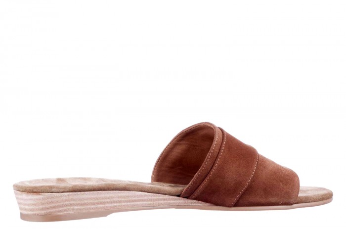 Geklede slipper op klein sleehakje van 2 cm. Lekker zacht met suède gevoerd voetbed en met decoratieve gesp over de voorvoet. In cognac- en zwart suède.