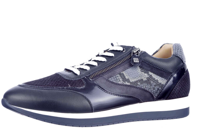 Helioform maakt sportieve veterschoenen tot maat 45 in spannende materialenmix en op stevige onderwerkken.  Trendvolgend, functioneel en geschikt voor wat vollere voeten (wijdte H). Ook voor dit seizoen weer een serie sneakers met een lijn van elegante citysneakers op dunner onderwerk in beige en donkerblauw en meer young fashion modellen op dikkere zool in wit, blauw, zwart, cognac en een gecombineerde uitvoering, Allemaal met verwisselbaar voetbed en met rits voor makkelijke instap. Deze uitvoering met blauwe materialenmix en klein stukje pythonprint  combineert top met een jeans.