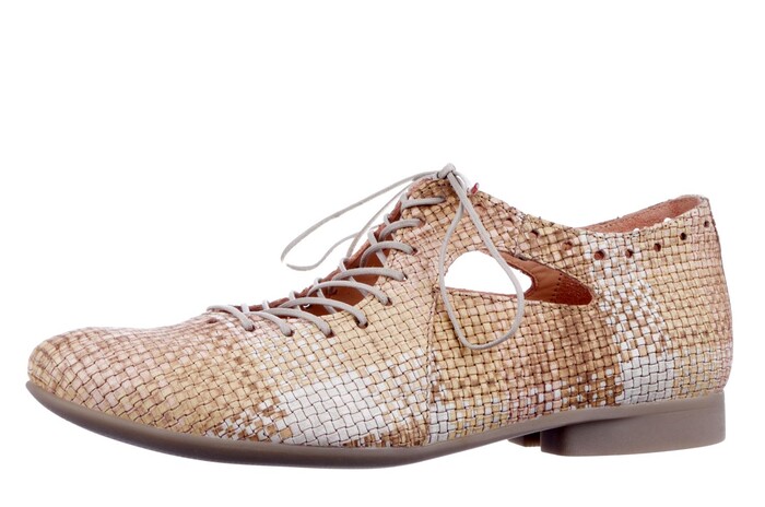 Het Oostenrijkse merk Think! heeft van meet af aan duurzaamheid tot kern van haar productie en bedrijfsvoering gemaakt. Een aantal productielijnen voldoen aan de allerstrengste eco-voorwaarden en zijn ook onderscheiden met het internationale Blue Angel predikaat van de VN: chroomvrij gekleurd leer, geproduceerd zonder chemicaliën en geproduceerd onder goede sociale werkomstandigheden. Goed voor de natuur en voor je voeten. Het zit al in de oproep om te denken (Think!) waarmee klanten worden aangesproken om onafhankelijke wegen te bewandelen.  Dit opengewerkte veterschoentje is inmiddels een klassieker en zien we iedere zomer graag terugkomen. Dit jaar in cognac- en zwart leer en in gevlochten naturel combinatie.