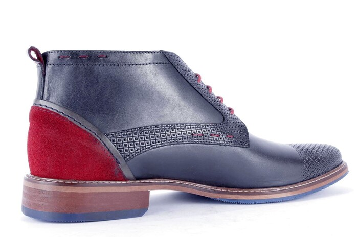 Veterboot met sierstiksel en wiebertjesprint op de neus. Het hielstuk is van| suède en afgebiesd met een contrastkleur. Deze mooie basic is gekleed maar niet| tè klassiek. Dit seizoen in drie uitvoeringen: cognac met blauwe details; grijs| met blauww details en in donkerblauw met cognac details.|