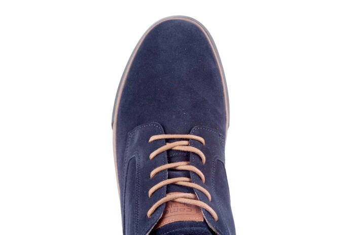 Desertboot van Camel op cognac gekleurde sneaker zool met en cognac detaillering voor. Waar het original heel sober is zonder franje is deze variant verfraaid met leren details op de suède upper. In antraciet- en donkerblauw suède.