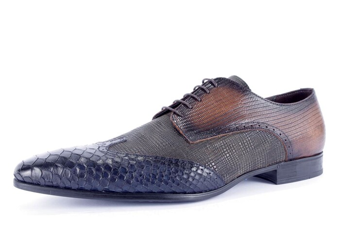 Giorgio heeft op een strakke klassieke Italiaanse leest weer twee fraaie| uitvoeringen gerealiseerd. In fantasievolle combinaties van krokodil- en python| print is er een variatie in zwart met cognac neus en een tricoloare variant met| blauwe neus, antraciet middenstuk en cognackleurige hiel. Dat lijkt heel bont| maaar de kleuren zijn gedekt dus kan prima onder een antraciet pak.|